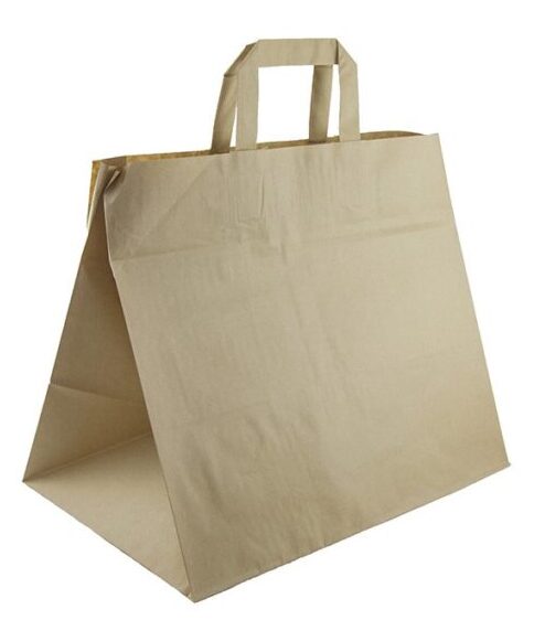 Натурална екологична хартиена торбичка с плоски дръжки и широко дъно, подходяща за takeaway. Всички продукти могат да бъдат изработени с печат и размер според нуждите на Вашия бизнес. За допълнителна информация, моля, да се свържете с нас.